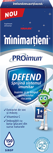 Există copii mai sensibili, care răcesc mai des. Pentru ei avem soluția Minimarțieni® ProImun Defend Sirop, destinate susținerii sistemului imunitar și a unei bune stări de sănătate și vitalitate. Are la bază o formulă complexă pe bază de beta-glucan, vitamina C și extracte naturale.